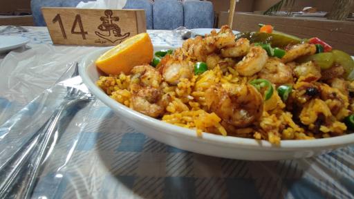 غذاها خوب بودن، قیمت یکم بالا بود، ما سینی دو نفره گرفتیم که میتونست سه نفرو کامل سیر کنه.یه پرس دوپیازه میگو داشت و چهار تکه بزرگ ماهی و یک پرس برنج عربی، من تا بحال دوپیازه میگو نخورده بودم و خوشم نیومد. اما ماهی ها و برنج خوب بودن. غذا یکم زیادی محلی بود و شاید همه پسند نباشه، مثلا ماهی ها خیلی مزه ماهی میداد و یکم بازی با ادویه لازم داشت، ما سس زدیم خیلی طعمش بهتر شد، برنج عربی خودش یک غذا جدا حساب میشد و من دوست داشتم، خوشبختانه غذا خیلی چرب نبود، برعکس اون یکی کامنت غذا اصلا خشک نبود و مابقی غذا ها هم که میدیدیم نه خشک بودن نه کم بودن، محیط داخل هم صندلی داره هم تخت که فرش تمیز و نویی داشت با کلی پشتی خوب، پرسنل خوب بودن و اجازه دادن باتری موتور رو ببریم داخل شارژ کنیم، حتی بیرون یک شارژ صلواتی داشتن، برعکس شاورما سوریه روبه روش که شب قبل با اکراه یک پریز خراب داد باتری موتورمون نصفه نیمه شارژ شد با اینکه ازشون دو پرس غذا گرفته بودیم
