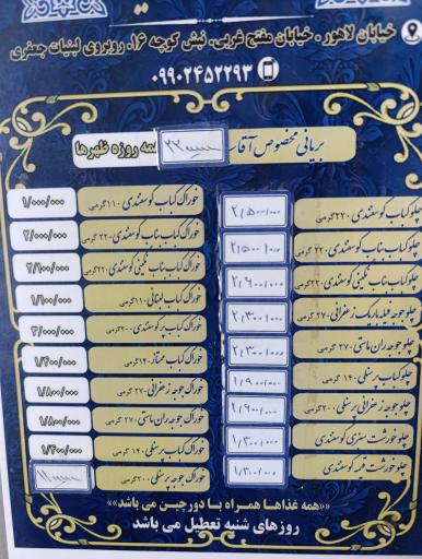 آدرس این رستوران، شهراصفهان لاهور، مبارزان شرقی، است. شما میتوانید هرگونه اطلاعاتی در مورد رستوران غذای آقا سید را از طریق شماره تلفن آن (09902452293) به دست بیاورید. برای اینکه عکسهایی از منو، فضا، غذاها و نوشیدنیهای این رستوران را ببینید، بهتر است سری به اینستاگرام آن به آدرس https://www.instagram.com/agha.seyed_catering?igsh=MW8zeHI1dWp6bHRpdA== بزنید.