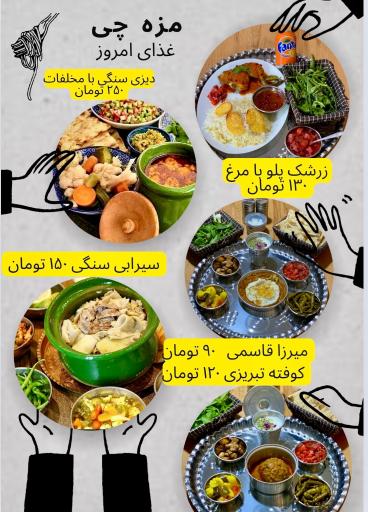 تهچین گوشت ، لوبیا پلو ، میرزاقاسمی،کشک بادمجان،قرمه سبزی،سیرابی سنگی،دیزی مخصوص