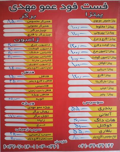 آدرس دقیق فست فود فست فود عمو مهدی، ساعت کاری، تصاویر و نزدیکترین ایستگاههای اتوبوس را میتوانید در ادامه مشاهده کنید. یادتان باشد در صورتیکه به این مکان رفتید، حتما نظرتان را در قسمت کامنت با ما و دیگران به اشتراک بگذارید.