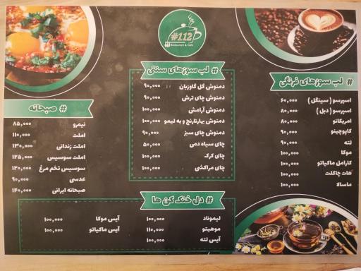 کافه رستوران 112 در محله عباس آباد - اندیشه تهران و خیابان شهید بهشتی واقع شده است. و از نظر موقعیت جغرافیایی در نزدیکی پاساژ کوروش و همچنین خدمات مسافرتی و گردشگری آسمان نخیل ، داروخانه صبا، کافه کاما، گارانتی حامی خدمات رایانه و همراه پارت و بانک سامان قرار گرفته است.