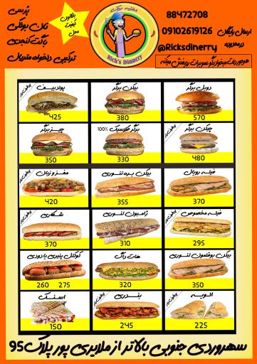 فست فود اغذیه ریک یکی از فست فودهای شهر تهران است که در محله سهروردی - باغ صبا قرار گرفته است. شماره تلفن فست فود اغذیه ریک +989102619126 است که هر اطلاعاتی در مورد این مکان نیاز داشته باشید در اختیار شما میگذارد. با مراجعه به آدرس اینستاگرام این فست فود ( https://www.instagram.com/ricksdinnery?igsh=aDRkdGtwemxqNzZn )، منو و عکسهای بیشتری از این مکان را میبینید. همچنین برای مشاهده فضا و عکس و فیلمهای مربوط به فست فود اغذیه ریک میتوانید به صفحه اینستاگرام آن به آدرس ricksdinnery بروید.