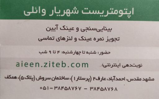 عینک و بینایی سنجی آئین (عینکسازی و بینایی سنجی) در محله احمد آباد مشهد و خیابان پرستار 1 واقع شده است. این مکان یکی از چهارده عینکسازی و بینایی سنجی در محله احمد آباد مشهد میباشد و از نظر موقعیت جغرافیایی در نزدیکی مراکز مهمی مانند بیمارستان قائم و دپارتمان استور لبازا و همچنین کلینیک فوق تخصصی بیمارستان قائم، پارکینگ عمومی طبقاتی پرستار، مرکز تخصصی دندان پزشکی جهاد دانشگاهی، فروشگاه موبایل آینه چی و کافه رستوران پالادیوم قرار گرفته است. همچنین با توجه به نظراتی که کاربران در اپلیکیشن نشان به این مکان دادهاند میتوان گفت این مکان یکی از عینکسازیهای خوب این منطقه میباشد. با توجه به نزدیکی این مکان به ایستگاه مترو قائم، برای دسترسی راحتتر و کمک به داشتن هوایی پاکتر، میتوانید از وسایل حمل و نقل عمومی برای مراجعه به آن استفاده کنید.