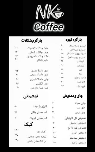 کافه NK (کافیشاپ) در محله چهارصد دستگاه تهران و خیابان زینتی افخم واقع شده است. این کافیشاپ یکی از یازده کافیشاپ در محله چهارصد دستگاه تهران میباشد و از نظر موقعیت جغرافیایی در نزدیکی مراکز مهمی مانند خانه و موزه استاد معین و استاد امیر جاهد و پاساژ آریا و همچنین فروشگاه کالا آرسی، آموزشگاه رانندگی پارس، پمپ بنزین اختصاصی 123، پلیس +10 پیروزی و آزمایشگاه پاتوبیولوژی و ژنتیک آلبرت قرار گرفته است. با توجه به نزدیکی این کافیشاپ به ایستگاه مترو ابن سینا، برای دسترسی راحتتر و کمک به داشتن هوایی پاکتر، میتوانید از وسایل حمل و نقل عمومی برای مراجعه به آن استفاده کنید.