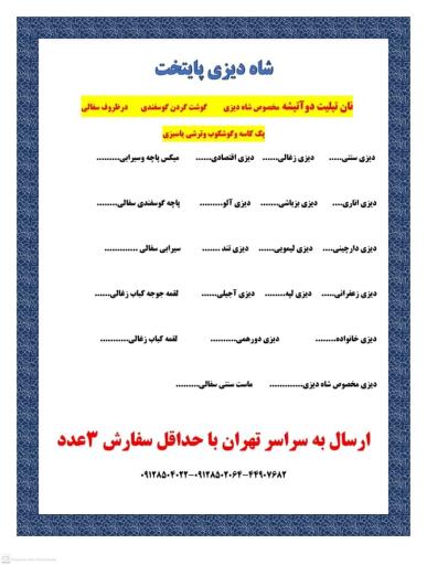 انواع دیزی زغالی وطعم دار وپاچه گوسفندی وسیراب شیردون با پخت وارسال در ظروف سفالی با پک کامل درب آن ارسال سریع به سراسر منطقه 21 و22 تهران