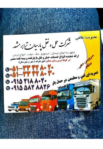 شرکت حمل و نقل پارسیان ترابر مشهد (شرکت باربری و حملونقل) در محله مصطفی خمینی مشهد و خیابان مصطفی خمینی 4- بسیج ۵۶ واقع شده است. و از نظر موقعیت جغرافیایی در نزدیکی ایستگاه اتوبوس بسیج 54، کافی شاپ سلطان، مسجد المهدی، چاج یدک و آتش نشانی ایستگاه 20 قرار گرفته است.