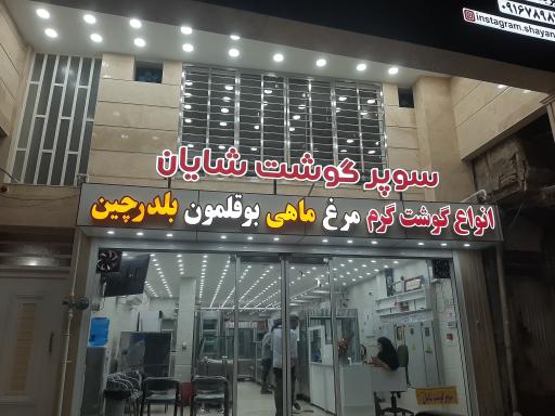 سوپرگوشت و مرغ شایان (فروشگاه فرآوردههای گوشتی و پروتئینی) در محله یوسفی اهواز و خیابان میثم تمار واقع شده است. این فروشگاه یکی از پنج فروشگاه فرآوردههای گوشتی و پروتئینی در محله یوسفی اهواز میباشد و از نظر موقعیت جغرافیایی در نزدیکی بازارچه آریاشهر و همچنین مسجد فاطمه زهرا (س)، فست فود شاپ، دفتر پیشخوان خدمات دولت و بخش عمومی، آش و حلیم کورهپز و پارکینگ حاج شعبان قرار گرفته است. همچنین با توجه به نظراتی که کاربران در اپلیکیشن نشان به این مکان دادهاند میتوان گفت این فروشگاه یکی از فروشگاههای فرآوردههای گوشتی پروتئینی خوب این منطقه میباشد.