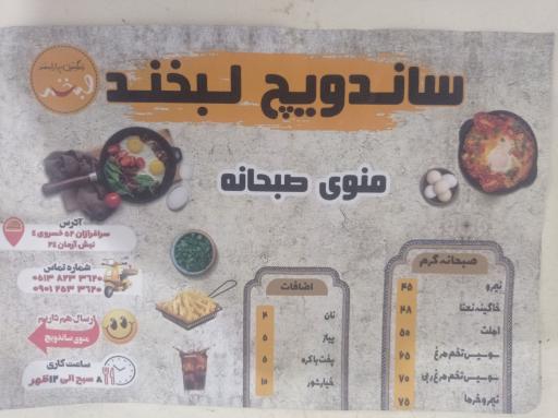 ساندویچ لبخند (فست فود) در محله سرافرازان مشهد و خیابان آرمان 24 واقع شده است. این مکان یکی از سی و یک فست فود در محله سرافرازان مشهد میباشد و از نظر موقعیت جغرافیایی در نزدیکی بیمارستان خطیب و همچنین کارگاه شیرینی پزی و نان وانیل، ایستگاه اتوبوس دلاوران 63، دبستان مسترشدی، کافه شکلات و کامپیوتر پردیس قرار گرفته است.