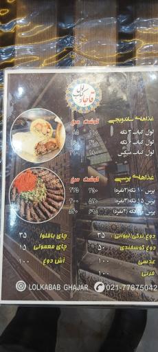 لول کباب قاجار (کباب و حلیمفروشی) در محله تهران پارس تهران و بلوار خوشوقت واقع شده است. این کبابی یکی از سیزده کباب و حلیم در محله تهران پارس تهران میباشد و از نظر موقعیت جغرافیایی در نزدیکی مرکز خرید پارسیان و همچنین دکتر مهدی مشایخی فوق تخصص اطفال و کودکان، ساندویچ پارس، کافه ژیوا، طباخی بره کوچولو و آش و حلیم سید مهدی قرار گرفته است.