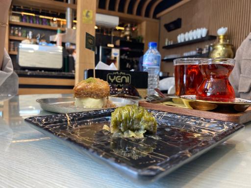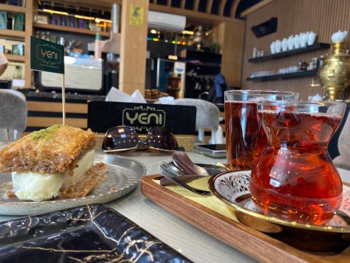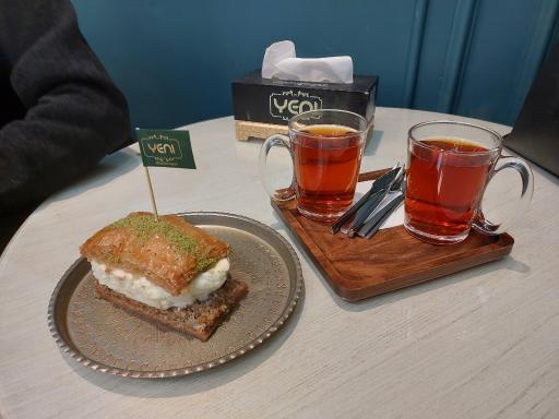 شیرینی باقلوا و بستنی با هم یکم زیادی بود و ما سه نفره سفارش دادیم و له نظرم اون میزان شیرینی برای دو نفر یکم زیاده ولی سه نفر اکیه. باقلوا های کم شکر و کم شیره تر هم داشتن که به نظرم مورد خوبیه. چای تلخ بود که با شیرینی باقلوا مچ خوبی بود. باقلوا پسته فکر میکنم سلیقه ای باشه و من اولین بار امتحان کردی ولی دوست نداشتم.باقلوای پسته به نظرم تازه تر و نرم تر از باقلوای باقلوا بستنی بود. از نظر قیمتی به نظرم قیمت باقلوا بالا بود و از این نظر یه ستاره کم دادم .البته قیمت چای ها به نظرم خیلی بهتر از کافه های دیگه اس و قیمت چای لیوانی ۲۹ تومن بود. پرسنل هم خوش برخورد بود،موقعیت مکانی کافه هم خوبه.