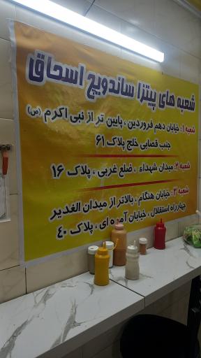 پیتزا و ساندویچ اسحاق (فست فود) در محله شیوا تهران و خیابان شاه آبادی واقع شده است. این مکان یکی از دوازده فست فود در محله شیوا تهران میباشد و از نظر موقعیت جغرافیایی در نزدیکی شهربازی سهند و همچنین سوپرمارکت بهنام، ساندویچ جزیره، کافی نت پازل، میدان شهدای تفحص و آرایشگاه گل سرخ قرار گرفته است. همچنین با توجه به نظراتی که کاربران در اپلیکیشن نشان به این مکان دادهاند میتوان گفت این مکان یکی از فست فودهای خوب این منطقه میباشد.