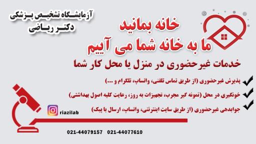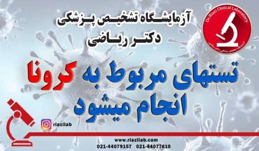 آزمایشگاه دکتر ریاضی (تاسیس۱۳۶۶) مدیر و مسئول فنی : دکتر علی شهرستانی انجام تمامی آزمایش ها و همچنین نمونه گیری در منزل ، محل کار برای تمام آزمایش ها و تست های مربوط به کرونا انجام می شود. پذیرش غیرحضوری اعزام پرسنل مجرب و حرفه ای نمونه گیری در محل شما جواب دهی اینترنتی