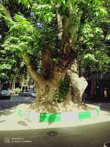 وسط یه میدون کوچیک که به اندازه قطر خود درخته. بین ۳۵۰تا۴۰۰یال قدمت داره. چندتا از شاخه ها وتنه های درخت رو بریدن. وقسمتی از اون رو با سیمان استتار کردن.