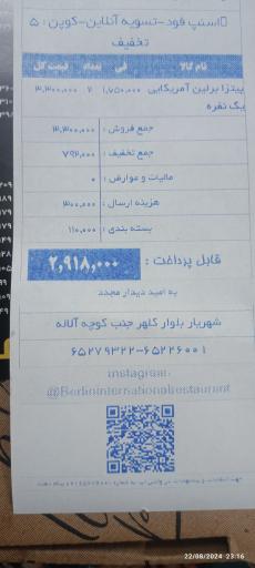 کافه رستوران بین المللی برلین همه روزه از ساعت 11 ظهر تا 1 بامداد آماده پذیرایی از همشهریان و میهمانان گرامی می باشد در ضمن با تماس تلفنی میتوانید خیلی فوری سفارشتان را درب واحد محل سکونت خود تحویل بگیرید