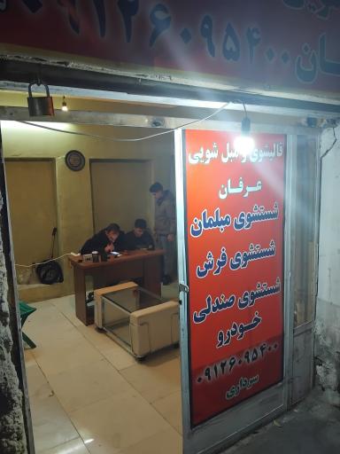 نمایش موقعیت منقالیشویی و مبل شویی عرفان در محله سلیمانی - تیموری تهران و خیابان رنجبر واقع شده است. این مکان یکی از چهار خدمات قالیشویی در محله سلیمانی - تیموری تهران میباشد و از نظر موقعیت جغرافیایی در نزدیکی مراکز مهمی مانند شهربازی ۲۲ بهمن و دوشنبه بازار و همچنین اقامتگاه سهند، مدرسه زهرا مردانی، آجیل و خشکبار شب چره، تورکوز و تعمیرگاه سی ان جی باقری قرار گرفته است.