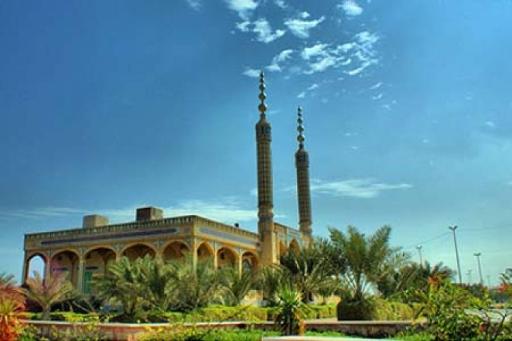 نمایش موقعیت منعالیه مسجدی با حس مثبت پر از انرژی بسیار زیبا در کناره ی آبهای نیلگون خلیج فارس