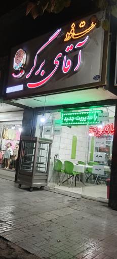 فست فود آقای برگر در کرمان و خیابان طالقانی واقع شده است. و از نظر موقعیت جغرافیایی در نزدیکی بازار بزرگ کرمان و همچنین کبابی سامان خان، خدمات کامپیوتری یاران رایان، مرکز تشخیص رنگ نوین، چاپ بابکان و کتاب فروشی فرهنگیان قرار گرفته است. همچنین با توجه به نظراتی که کاربران در اپلیکیشن نشان به این مکان دادهاند میتوان گفت این مکان یکی از فست فودهای خوب این منطقه میباشد.