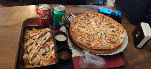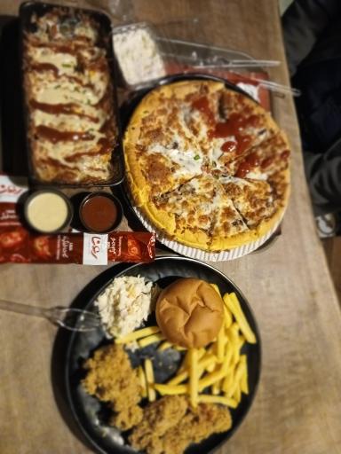 غذا عالی و با کیفیت . 4 عدد پیتزای مخلوط 1 نفره سفارش دادیم که هر پیتزا برای 2 نفر کافی بود . سیب زمینی ویژه هم با متریال خوب و عالی درست شده بود . فضا دلنشین و برخورد پرسنل عالی بود . قیمت هم نسبت به کیفیت مناسب بود .