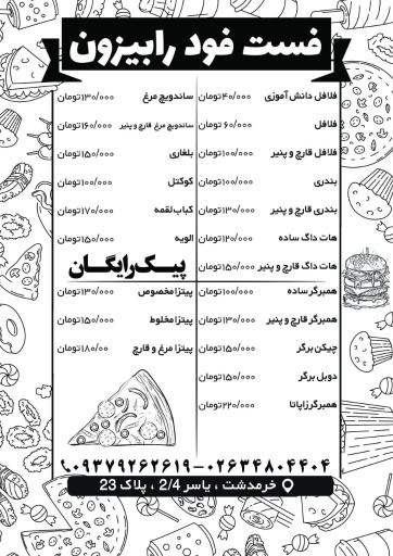فست فود رابیزون را میتوانید در شهر کمال شهر، محله خرمدشت پیدا کنید. شما میتوانید هر اطلاعاتی در مورد فست فود رابیزون نیاز دارید، از طریق شماره تلفن آن (02634804404) به دست بیاورید.