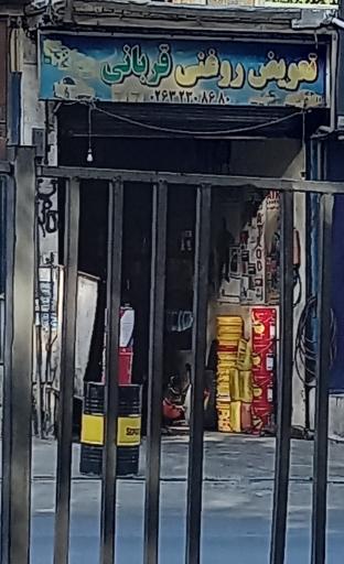 تعویض روغن قربانی (تعویض روغنی) در البرز و بزرگراه لشگری واقع شده است. و از نظر موقعیت جغرافیایی در نزدیکی ذغال فروشی میثاق و همچنین کافی نت نوین، تالار عمارت خورشید، اتو سرویس و تعمیرگاه دروگر، رستوران و کمپ ترک اعتیاد مهرورزان غرب قرار گرفته است.