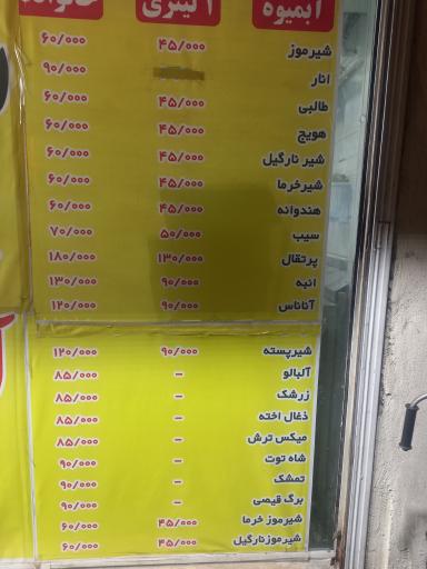 وقتی نصف قیمت و بلکه کمتر هزینه می کنید نباید با آبمیوه فروشی های معروف و مطرح مقایسه کنید. با این قیمت بسیار قابل قبوله، مخصوصا شیرنارگیل و شیرپسته خیلی خوشمزه س. آب آلبالو و آب زرشک معمولی. حتما امتحان کنید.