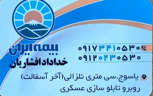بیمه ایران خداداد افشاریان (نمایندگی بیمه) در محله کوی کارمندان تلزالی یاسوج و بلوار شهید قرنی، سی متری شهدای تل زالی واقع شده است. این مکان یکی از سه نمایندگی بیمه در محله کوی کارمندان تلزالی یاسوج میباشد و از نظر موقعیت جغرافیایی در نزدیکی مراکز مهمی مانند بوستان شهروند و مرکز آموزشی درمانی شهدای دولت آباد بیمارستان شهید جلیل و همچنین سفره خانه سنتی یاغوش، تعمیرگاه لوازم خانگی پناهی، باشگاه بدنسازی آسیا، مسجد امام جعفر صادق (ع) یاسوج و فروشگاه ابزار محسن قرار گرفته است.