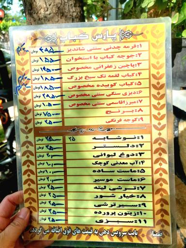 پارس کباب (کباب و حلیمفروشی) در خراسان رضوی، شهرستان بینالود، روستای ابرده و بولوار میلاد واقع شده است. و از نظر موقعیت جغرافیایی در نزدیکی مرکز خدمات جامع سلامت ابرده علیا، داروخانه دکتر محمد دوست، کباب کندوان، لبنیات سنتی ابوالفضلی و تعویض روغن و چکاپ اتومبیل قرار گرفته است. همچنین با توجه به نظراتی که کاربران در اپلیکیشن نشان به این مکان دادهاند میتوان گفت این کبابی یکی از کبابیها و حلیمفروشیهای خوب این منطقه میباشد.