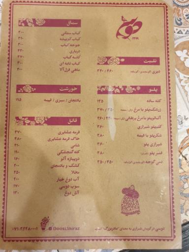 بعد از تحقیق زیاد اومدیم اینجا واقعا همه چیز عالی بود تمام رستوران های شیراز فضای خوبی دارن و قسمت بالایی ولی مهم اینه قیمت به کیفیت بیارزه و دوسی این ویژگی رو داره از نظر حجم و کیفیت و خدمات قنبر پلو و قرمه عشایری و کلمه پلو زدیم جاتون خالی
