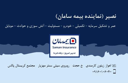 بیمه سامان (نمایندگی بیمه) در محله زیتون کارمندی اهواز و خیابان حجت واقع شده است. این مکان یکی از سی و دو نمایندگی بیمه در محله زیتون کارمندی اهواز میباشد و از نظر موقعیت جغرافیایی در نزدیکی مراکز مهمی مانند شهربازی سرزمین سحر آمیز و سیتی سنتر مهزیار و همچنین داروخانه دکتر سلیمانی، کافی نت پاتریس، فلافل کده یه جای خوب، پارکینگ طبقاتی سیتی سنتر مهزیار و گالری بدلیجات دنیای فیروزه ای قرار گرفته است. همچنین با توجه به نظراتی که کاربران در اپلیکیشن نشان به این مکان دادهاند میتوان گفت این مکان یکی از نمایندگیهای بیمه خوب این منطقه میباشد.