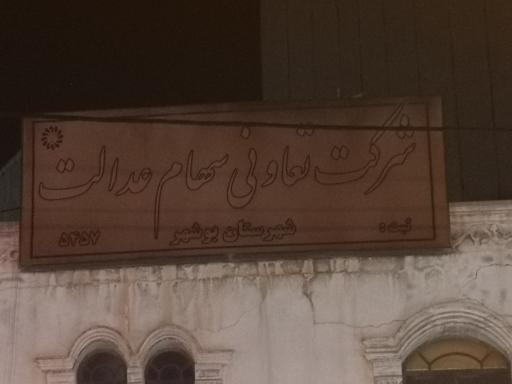 شرکت تعاونی سهام عدالت شهرستان بوشهر (اداره و سازمان دولتی) در محله سنگی غربی بوشهر و بلوار امام خمینی، شهدای مسجد توحید، پاسارگاد، پاسارگاد 16، بین بهارستان 37 و 39 واقع شده است. این اداره یکی از شانزده اداره و سازمان دولتی در محله سنگی غربی بوشهر میباشد و از نظر موقعیت جغرافیایی در نزدیکی آژانس مسافرتی سیاحت پرواز دنیا، آش رضا، سالن زیبایی آلان، کارواش دریا و فروشگاه ته لنجی شارجه قرار گرفته است.