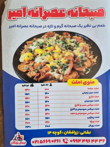 صبحانه و عصرانه امیر (رستوران) در محله زرافشان اسلامشهر و خیابان صمدی 14 واقع شده است. این رستوران یکی از سه رستوران در محله زرافشان اسلامشهر میباشد و از نظر موقعیت جغرافیایی در نزدیکی مراکز مهمی مانند خانه بازی لی لی پوت و مرکز خرید باغ فیض و همچنین باشگاه ورزشی قاسمی، رستوران تک پخت، آموزشگاه آرایشگری الهه کرمی، دفتر خدمات الکترونیک قضایی سيد كامران مصطفوی و شیرینی سرای شمشیری قرار گرفته است. همچنین با توجه به نظراتی که کاربران در اپلیکیشن نشان به این مکان دادهاند میتوان گفت این رستوران یکی از رستورانهای خوب این منطقه میباشد.