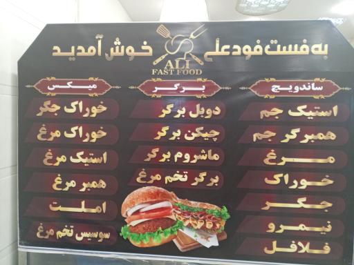 فست فود علی در خراسان رضوی، شهرستان مشهد و خیابان غلامی 4 واقع شده است. و از نظر موقعیت جغرافیایی در نزدیکی اغذیه سید ، کبابی علی، مرکز خدمات جامع سلامت شهید غلامی، گروه مشاورین املاک همسایه و باشگاه ورزشی رزمی قرار گرفته است. همچنین با توجه به نظراتی که کاربران در اپلیکیشن نشان به این مکان دادهاند میتوان گفت این مکان یکی از فست فودهای خوب این منطقه میباشد.