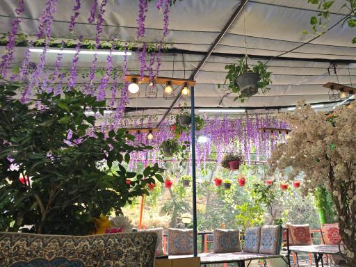 محلی باصفا با گلهای فراوان تخت متنوع جهت پذیرایی قیمت غذا مناسب کیفیت کباب و جوجه هاش خوب