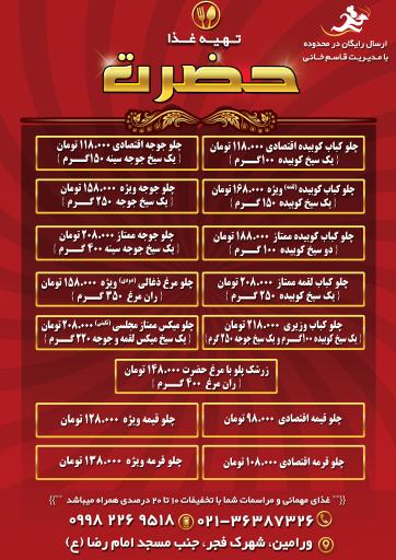 تهیه غذا و آشپزخانه حضرت (کترینگ و تهیه غذا) در ورامین و خیابان والفجر ۲۰۵ واقع شده است. و از نظر موقعیت جغرافیایی در نزدیکی فستفود هاتلند، مسجد امام رضا، املاک صابر ، نانوایی بربری و آرایشگاه کاترییِل قرار گرفته است.