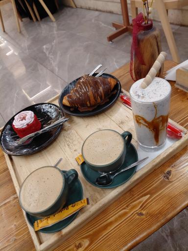 دکور بسیار زیبایی داشت مخصوصا طبقه بالا. ما شیر نسکافه و شیک اسنیکرز و کروسان شکلاتی و کیک توت فرنگی رو امتحان کردیم. ترکیب کروسان شکلاتی با شیر نسکافه خیلی خوشمزه بود. فقط طعم کیک توت فرنگی رو نپسندیدیم وگرنه بقیهشون خوب بود