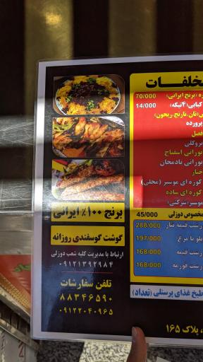 نمایش موقعیت منسلام کباب عالی بود معلوم بود همانطور که نوشته گوشت گرم بود و قاطی هم نداشت . وزن و قیمت هم عالی فقط از نظر من زیادی چرب بود والا اشکال دیگه ای نداشت جوجه زعفرانی ران هم همینطور عالی بود و برخورد پرسنل بسیار خوب بود . در مجموع یکی از کبابسراهای خوب تهرانه. من حضوری رفتم معطل شدم کمی ولی متوجه شدم میتونید تلفنی سفارش بدید و درزمان مراجعه سریعتر تحویل بگیرید و کمتر معطل میشید.۲ تا گیشه سفارش دارن یکی برای سفارش حضوری و یکی برای سفارش تلفنی