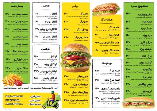 برگر، هات داگ، کوکتل، ژامبون تنوری، فیله مرغ، سیب زمینی،فلافل، ژامبون سرد