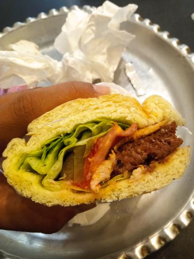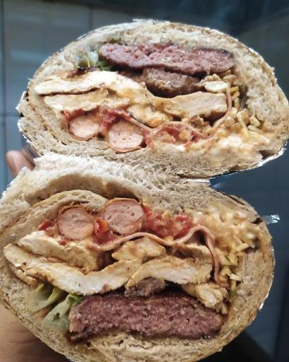 خیلی ساندویچاشون پر حجم و بزرگ هست با یکی ۲ نفر سیر میشن سس فله هم دارن میتونید هر چقدر خواستید استفاده کنید جای نشستن هم دارن پیک هم دارن خیلی مکانی زیبا هست سفارشاتتون رو سریع تحویلتون میدن وزن ساندویچ ها از 300 گرم تا ۱۰۰۰ گرم دارن زیر ۳۰۰ گرم ندارن خیلی خوشمزه و عالی هست پرسنل هم خیلی تمیز و با دستکش و کلاه کار میکنند ساندویچاشون اسم های خاصی داره