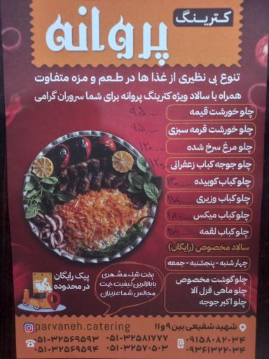 کترینگ پروانه (رستوران) در محله ثامن مشهد و خیابان شهید شفیعی واقع شده است. این رستوران یکی از سه رستوران در محله ثامن مشهد میباشد و از نظر موقعیت جغرافیایی در نزدیکی گالری هلن و همچنین دبستان پاسداران، حسینیه ابوالفضلی مرکزی گلشهر، مجموعه ورزشی حافظ، مطب دکتر پاسبان رضوی و نانوایی نصری قرار گرفته است. همچنین با توجه به نظراتی که کاربران در اپلیکیشن نشان به این مکان دادهاند میتوان گفت این رستوران یکی از رستورانهای خوب این منطقه میباشد.