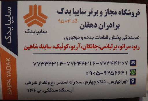 فروشگاه داروخانه اتومبیل - سایپا یدک (لوازم یدکی خودرو) در محله تهرانپارس شرقی تهران و خیابان کنارگذر زین الدین واقع شده است. این فروشگاه یکی از سی و یک لوازم یدکی خودرو در محله تهرانپارس شرقی تهران میباشد و از نظر موقعیت جغرافیایی در نزدیکی ایران آی تی سنتر و همچنین تعمیرگاه گیربکس اتوماتیک کارا، پرنده فروشی سیمرغ، شیشه اتومبیل اتحاد، کنگره 60 نمایندگی صالحی و لوازم یدکی رضایی قرار گرفته است. همچنین با توجه به نظراتی که کاربران در اپلیکیشن نشان به این مکان دادهاند میتوان گفت این فروشگاه یکی از فروشگاههای لوازم یدکی خودرو خوب این منطقه میباشد.