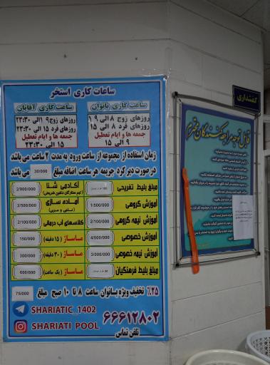 استخر شریعتی در محله حسینی فردوس تهران و خیابان معراجی نیا واقع شده است. این مجموعه یکی از دو استخر شنا در محله حسینی فردوس تهران میباشد و از نظر موقعیت جغرافیایی در نزدیکی مجتمع تجاری ولیعصر و همچنین باشگاه علی بن ابی طالب (ع)، بوستان یاس، دبیرستان پسرانه جواد موفقیان، فست فود امید و لوازم یدکی خودرو قائم قرار گرفته است.