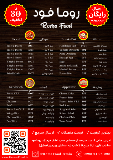 یکی از فست فودهای شهر ارومیه، فست فود روما فود است که در محله جامی قرار گرفته است. برای اینکه اطلاعات بیشتری از فست فود روما فود به دست بیاورید، میتوانید با شماره تلفن آن (09982498098) تماس بگیرید. وبسایت این فست فود به آدرس roma-food.ir منو و عکسهای بیشتری از این مکان را در اختیار شما قرار داده است.