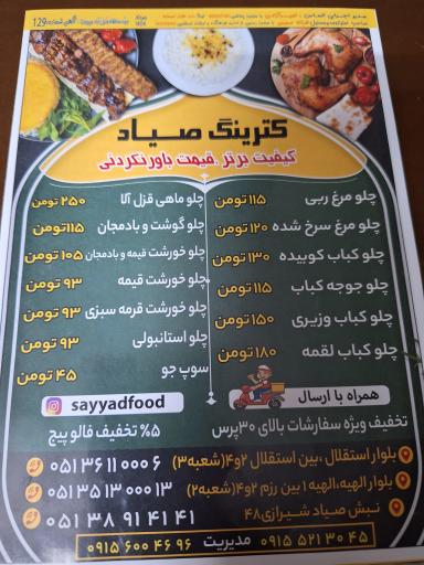 کترینگ صیاد (کترینگ و تهیه غذا) در محله آزادشهر مشهد و بلوار استقلال واقع شده است. این مکان یکی از دوازده کترینگ و آشپزخانه در محله آزادشهر مشهد میباشد و از نظر موقعیت جغرافیایی در نزدیکی مرکز خرید و همچنین آموزشگاه زبان مهاجر، پایگاه اهدای خون میلاد، سوخاری کیلویی جوجه خروس ، پیرایش علی و ایستگاه اتوبوس میدان استقلال قرار گرفته است. همچنین با توجه به نظراتی که کاربران در اپلیکیشن نشان به این مکان دادهاند میتوان گفت این مکان یکی از کترینگها و تهیه غذاهای خوب این منطقه میباشد.