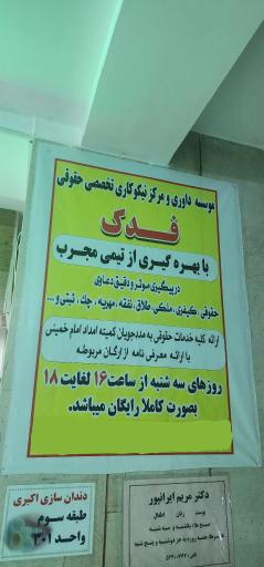 مرکز نیکوکاری حقوقی فدک (دفتر وکالت و مشاوره حقوقی) در مبارکه و خیابان بسیج شمالی واقع شده است. و از نظر موقعیت جغرافیایی در نزدیکی مرکز خرید امید و همچنین پیتزا طهرونی، کافه رستوران گپ، لوازم قنادی و تولد گندم ، آزمایشگاه تشخیص طبی امداد مبارکه و موبایل دانش قرار گرفته است.