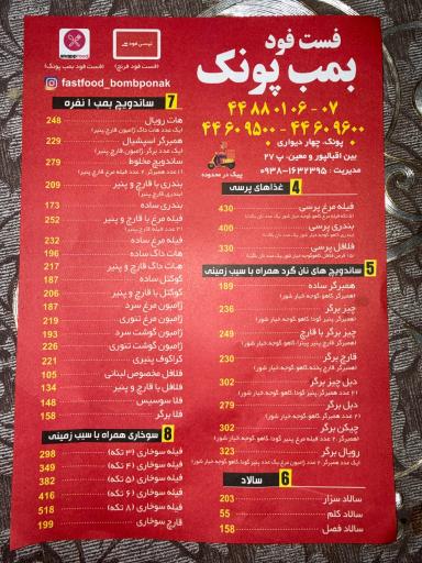 فست فود بمب پونک یکی از غذاخوریهای شهر تهران است که در محله شهرک کوهسار قرار دارد. شما میتوانید از طریق تماس با شماره تلفن 02144880107 هر اطلاعاتی در مورد فست فود بمب پونک نیاز داشتید، به دست بیاورید.