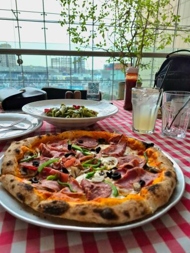 نمایش موقعیت منقیمتها بالاست. کیفیت مواد اولیه به کار برده شده خیلی عالیه. اما پختش متوسط یا قابل قبوله. ما پاستا پستو گرفتیم با پیتزا نوستالژیکا (همون پیتزا مخلوط خودمون) مزه غذاها خوب بود. طعم روغن زیتون عالی اما روغنش زیاد بود. مرغ پاستا خوبی خوب طعمدار شده بود و آبدار و خوشمزه بود. پنیر پتیزای پیتزا هم کم بود که برای سلامتی و سیستم گوارش خیلی مناسبه. ما چای هم گرفتیم. طعم چای هم عالی بود. برخورد پرسنل هم خوب. ویوش خوبه. بعضی صندلیهاش راحت نیست ولی.