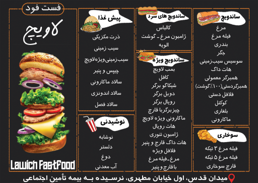 شما میتوانید آدرس دقیق فست فود فست فود لاویچ، ساعت کاری، تصاویر و نزدیکترین ایستگاههای اتوبوس را در ادامه مشاهده نمایید. اگر به این مکان رفتید، یادتان باشد حتما نظرتان را در قسمت کامنت با ما و دیگر کاربران به اشتراک بگذارید.