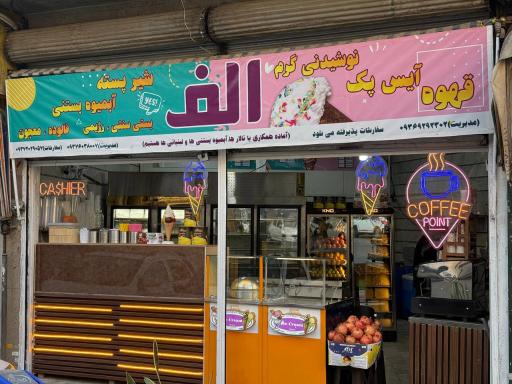 ابمیوه بستنی الف (بستنیفروشی و آبمیوهفروشی) در محله مسعودیه تهران و خیابان پیرهادی واقع شده است. این مکان یکی از یازده آبمیوه و بستنی در محله مسعودیه تهران میباشد و از نظر موقعیت جغرافیایی در نزدیکی پنج شنبه بازار مسعودیه و همچنین ساندویچ و پیتزا تاج محل، لوازم التحریر آلفا، دبیرستان جابر ابن حیان، کافی نت چیتا و خشکشویی قرار گرفته است.