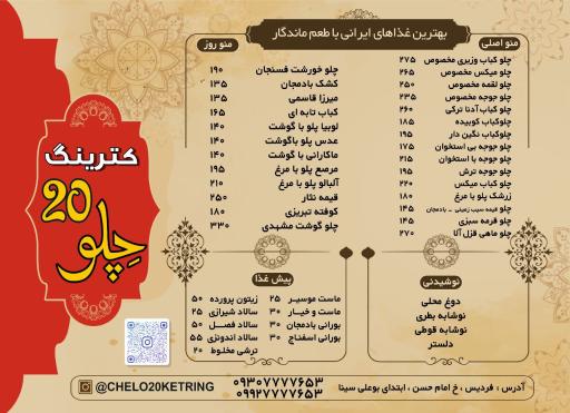 کترینگ چلو 20 (کترینگ و تهیه غذا) در محله سرحدی فردیس و خیابان بو علی سینا واقع شده است. این مکان یکی از پنج کترینگ و آشپزخانه در محله سرحدی فردیس میباشد و از نظر موقعیت جغرافیایی در نزدیکی مراکز مهمی مانند خانه بازی رنگین کمان فردیس و بازارچه دستفروشان فردیس و همچنین فروشگاه دوربین مداربسته و دزدگیر الکتروسانیار، کارواش، مصلای امام خمینی، فلافل جنوب و مهدیه آل یاسین قرار گرفته است.