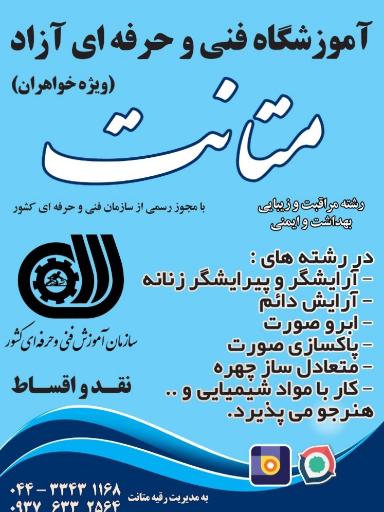 نمایش موقعیت منآموزشگاه فنی و حرفه ای مراقبت و زیبایی متانت (ویژه خواهران) (موسسه آموزشی) در محله شهرک دانشگاه ارومیه و بزرگراه شهید باهنر، محمد علی فرح بخش، بهاران، کوچه 2 واقع شده است. این موسسه یکی از دو موسسه آموزشی در محله شهرک دانشگاه ارومیه میباشد و از نظر موقعیت جغرافیایی در نزدیکی فست فود فرات ، قالیشوی فواد، شرکت گاز استان آذربایجانغربی، داروخانه شبانه روزی دکتر پویا و شیرینی سی گل قرار گرفته است.